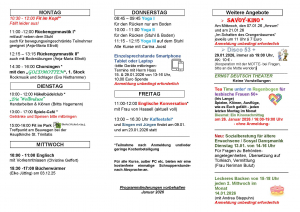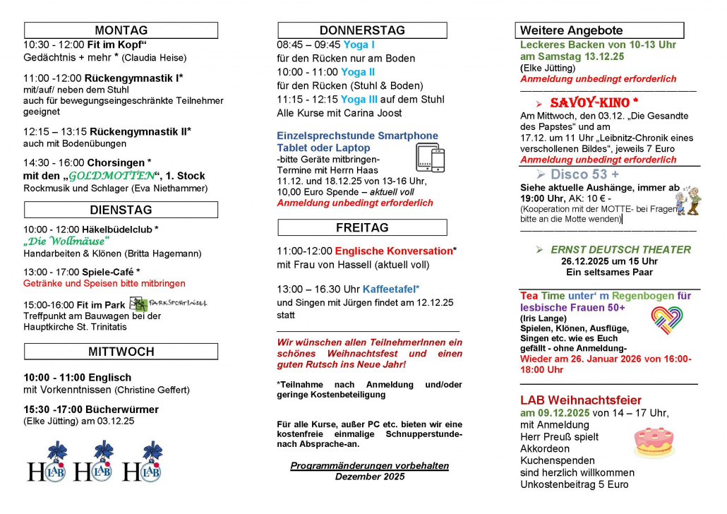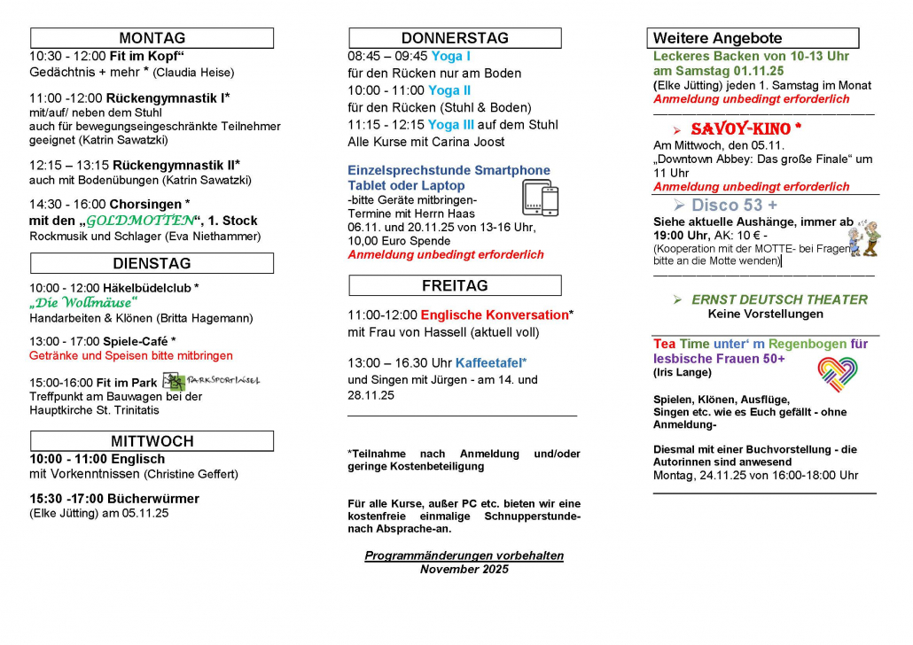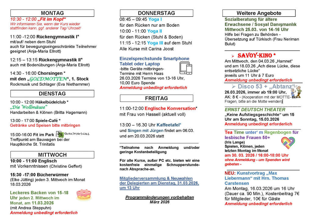 Außerdem gehören zum Angebot unter fachkundiger Anleitung u.a.: Handy – und Tabletkurse, Tagesausflüge, Englischkonversation, gemeinsame Kino- und Theaterbesuche, Spielenachmittage, Malen, Handarbeiten, Gymnastik und Yoga, etc..