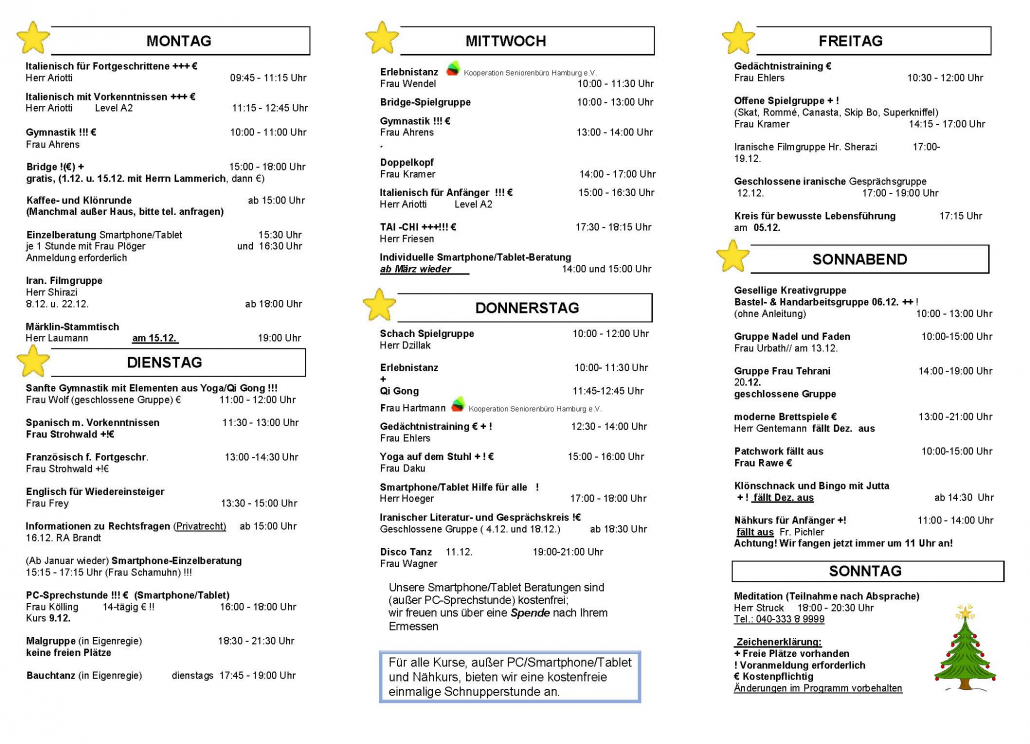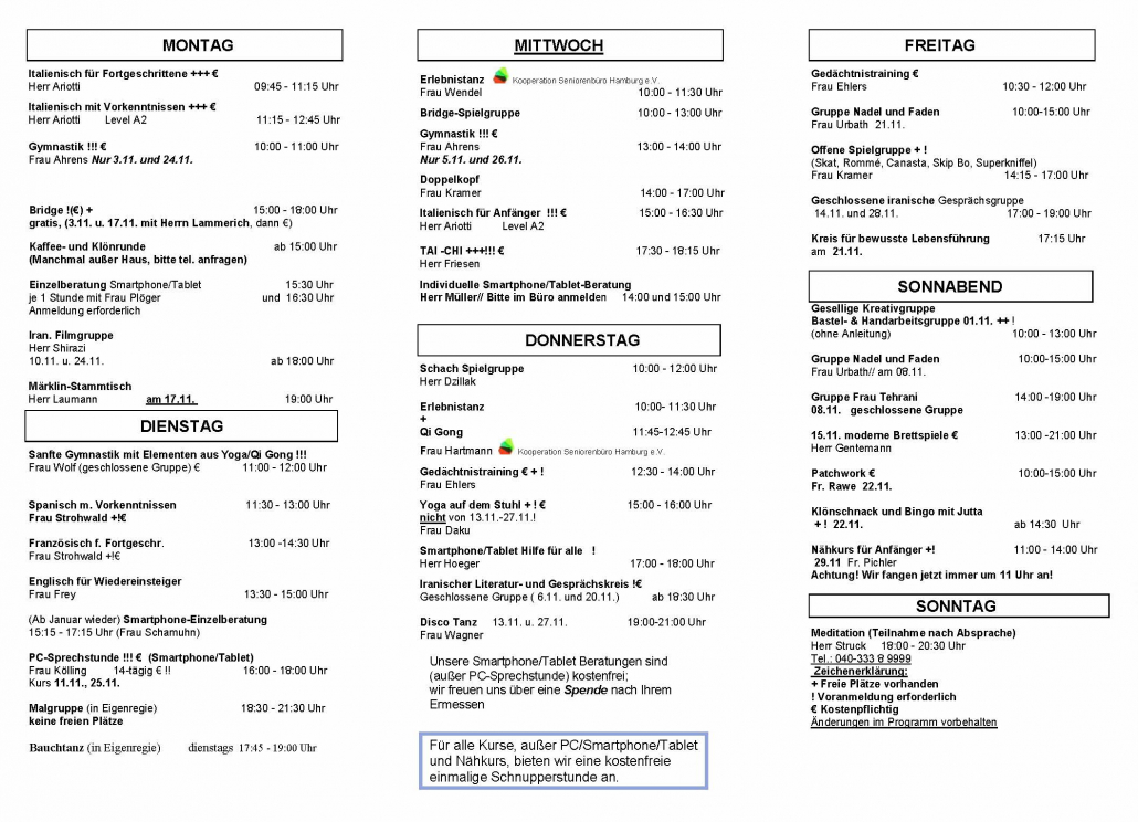 Zum Angebot gehören u.a.: Englisch-, Französisch-, Spanisch- und Italienischkurse, mehrere Tanzgruppen,  Gedächtnistraining, Gymnastik, Bauchtanz, Tai Chi, Yoga, Qigong, Pilates, Bauchtanz, Meditation, Bridge, Schach, Canasta, Rommee, Skat, Bingo, sowie  PC/Smarthpone/Tablet-Sprechstunden und eine Bastel und Nähgruppen (inkl. Patchwork). Außerdem treffen sich bei uns ein Märklin Stammtisch, eine Malgruppe und iranische Gruppen. Neuerdings kann man bei uns auch singen, denn wir haben eine Chorgruppe. Unsere jahreszeitlichen Feiern erfreuen sich auch großer Beliebtheit!