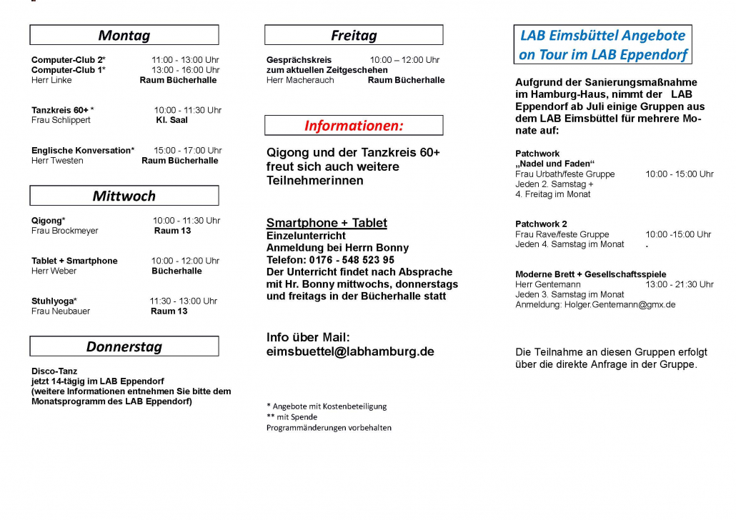 Die Angebote werden entweder ruhen oder wurden anderweitig verteilt: Einige Angebote finden in einem Raum der Bücherhalle statt, andere im Raum Nr. 13 und die Handarbeitskurse finden im LAB Eppendorf statt. Der Tanzkurs findet nach wie vor im kleinen Saal statt.