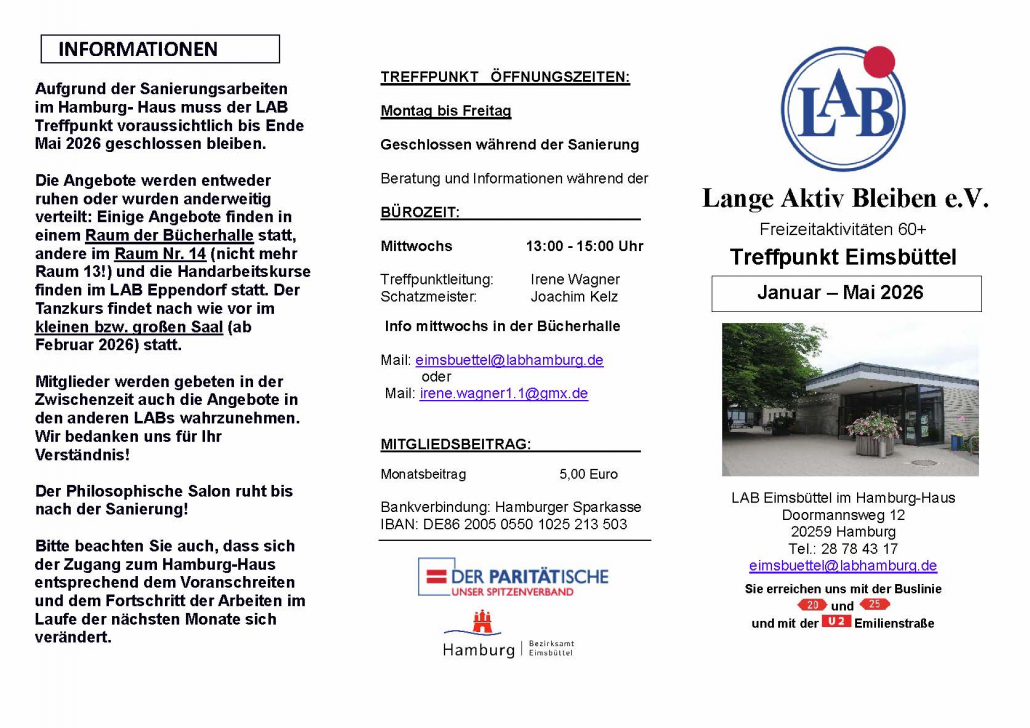 Die Angebote werden entweder ruhen oder wurden anderweitig verteilt: Einige Angebote finden in einem Raum der Bücherhalle statt, andere im Raum Nr. 13 bzw. 14. Die Handarbeitskurse, Disko und der Spieletreff finden im LAB Eppendorf statt. Der Tanzkurs findet nach wie vor im kleinen Saal bzw. ab Februar 2026 im großen Saal statt.