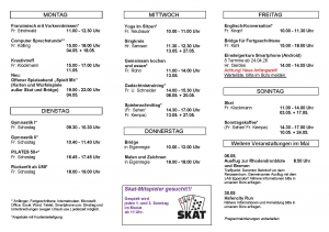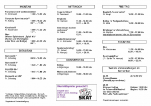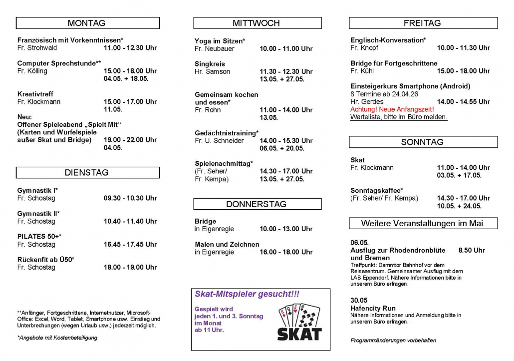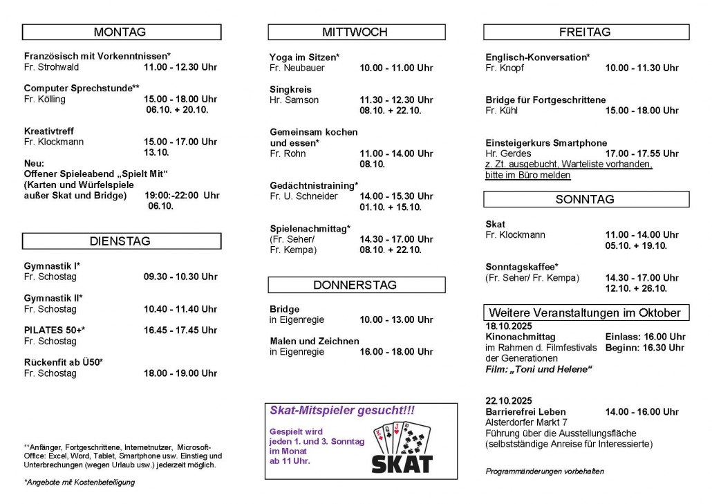 Zusätzlich befinden sich im Programm u.a.: Bridge, Skat, Englischkurse, Französischunterricht, Gymnastik, Yoga, Pilates, Gedächtnistraining, Malkurse, Stricktreffen, Kinoabende und individuelle Computersprechstunden für Anfänger oder „Profis“.