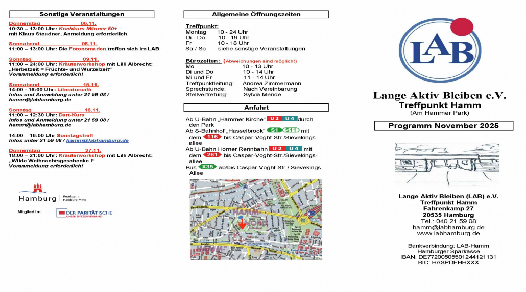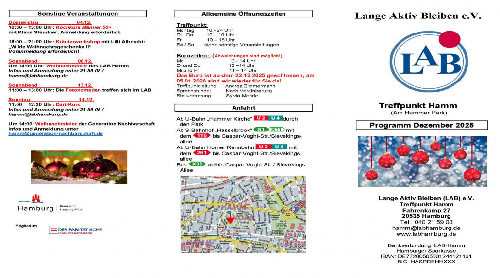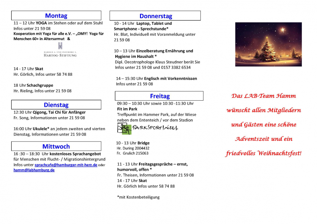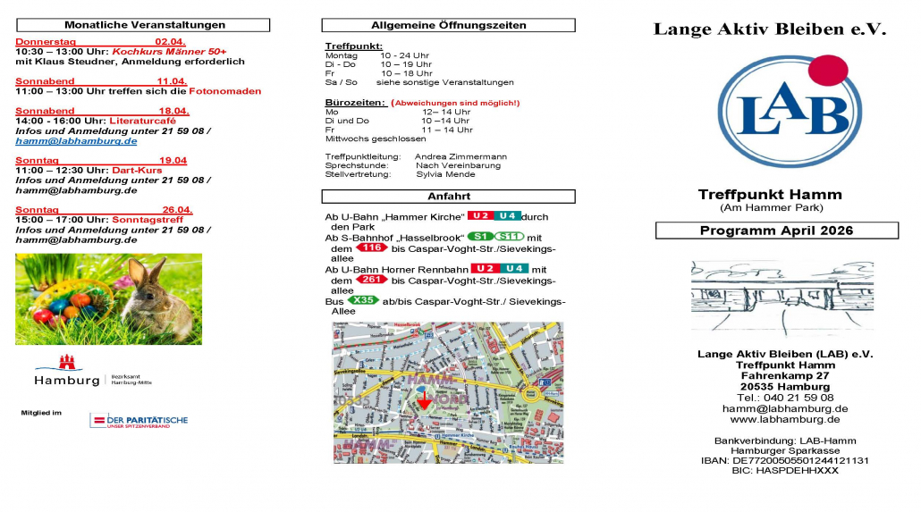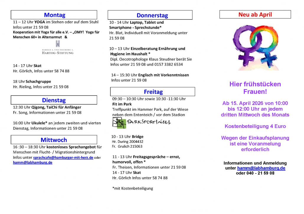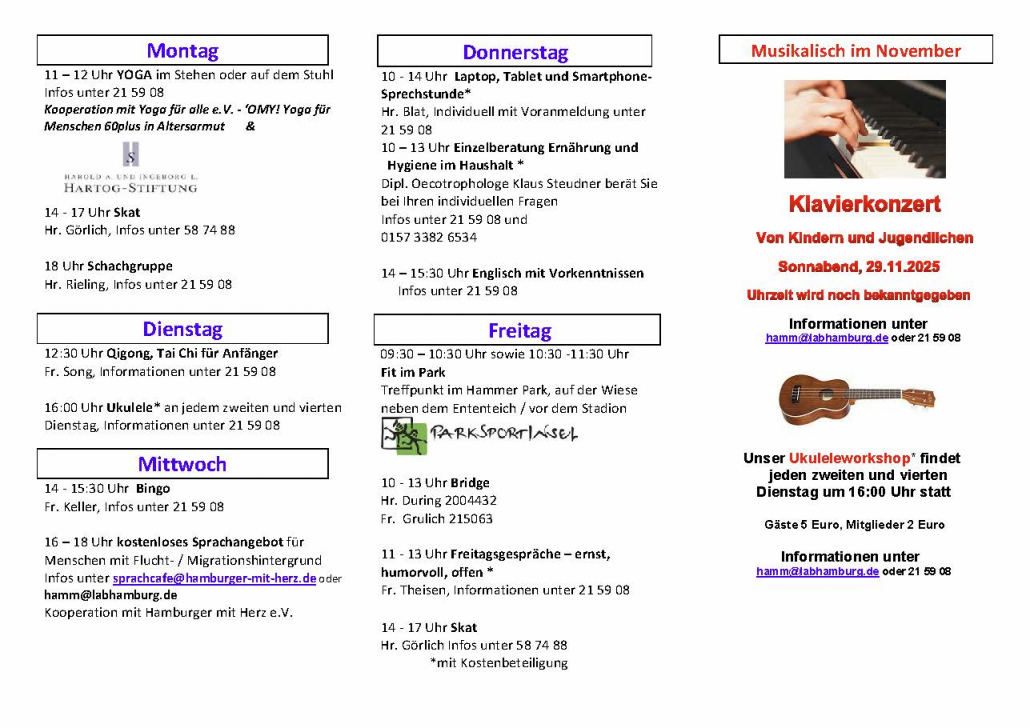 „Ein Leben lang aktiv bleiben!“ – unter diesem Motto bieten wir im Treffpunkt Hamm seit über 50 Jahren ein buntes Programm für die ältere Generation. Ob verschiedene Spiele, Tai Chi / Qigong für Anfänger, Gesprächskreise, Fotografie, Englisch, individuelle Digital-Hilfe, Ernährungsberatung und Kochen – für jeden ist etwas dabei. Workshops, Lesungen, Konzerte und Feiern runden das Programm ab.