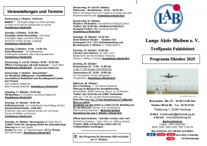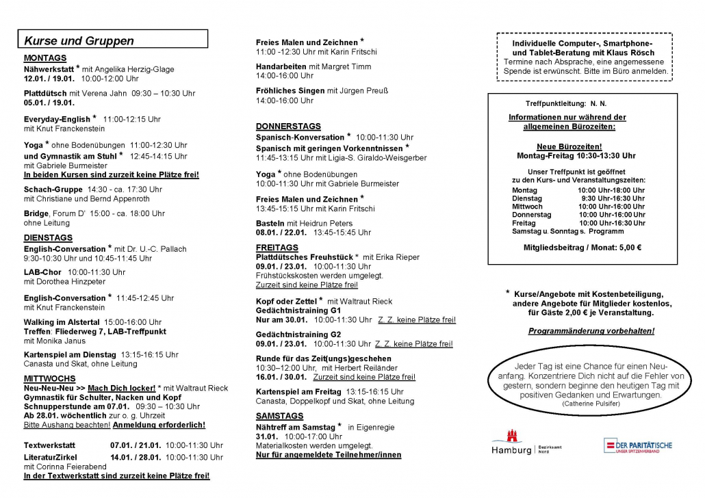 Im Angebot sind: verschiedene Sprach- und Konversationskurse, Malen, Gedächtnistraining, Literatur, Yoga, Gymnastik, Chor, Singkreis, plattdeutsches Frühstück, Handarbeiten, Basteln, Schach, Bridge, Skat, Canasta, Doppelkopf und Bingo.
