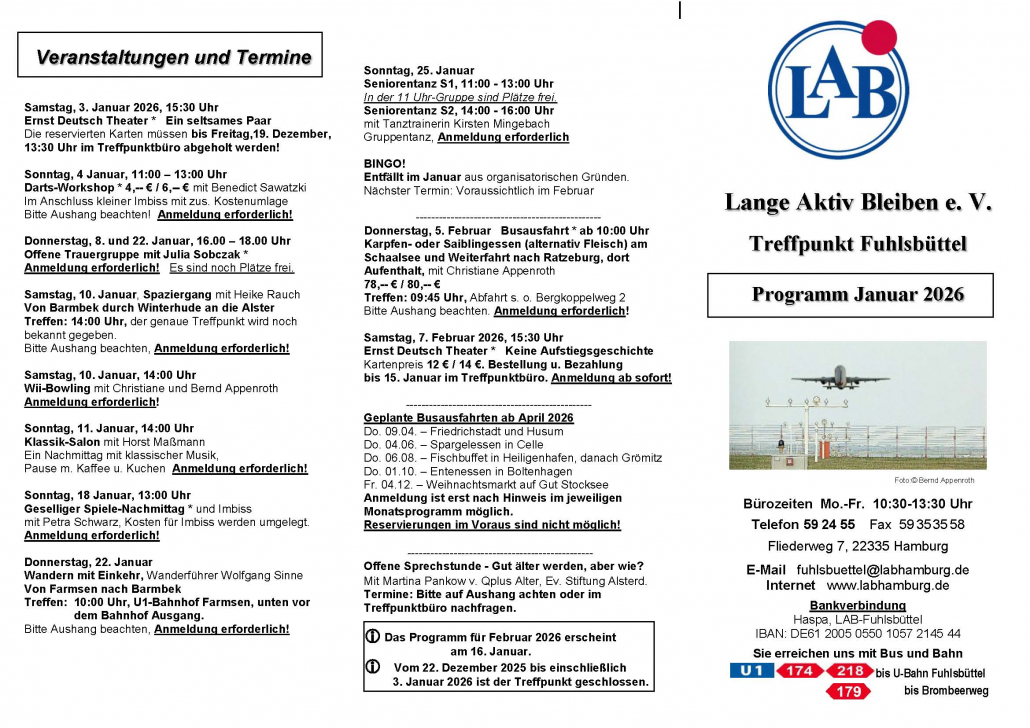 Gemeinsame Unternehmungen außerhalb des Treffpunktes werden ebenfalls angeboten, z.B. Walking, Wandern, Fahrradtouren, Kegeln, Besichtigungen und Rundgänge in Hamburg, Theaterbesuche, Tages-Busfahrten und einmal im Jahr eine 6-7 tägige Gruppenreise.