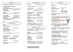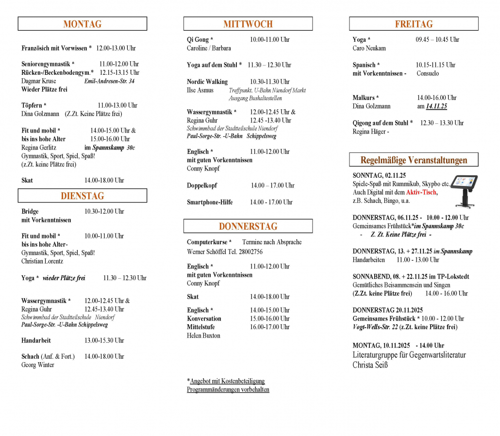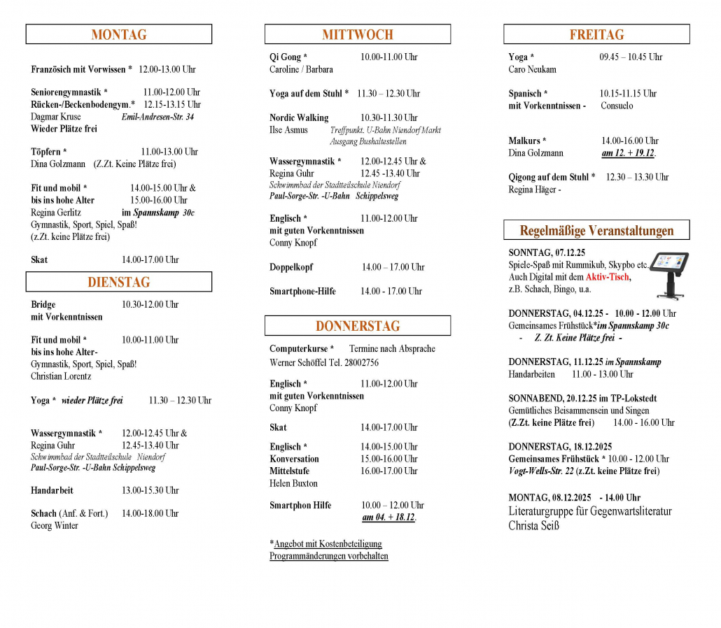 Zu den weiteren Angeboten gehören u.a.: Tablet- und Smartphone Sprechstunde, Bridge, Rummykub, Uno, Bingo, Schach, Wassergymnastik, Rücken-, Sitz- und Beckenbodengymnastik, Nordic Walking, Qigong, Kegeln Italienischkurs, Englischkurs, Spanischunterricht, Singen, ein Literaturkreis, Malen, Töpfern oder Handarbeiten.