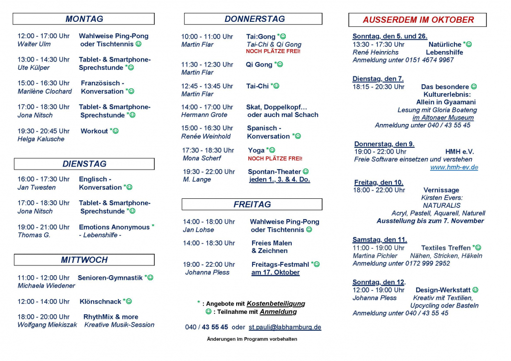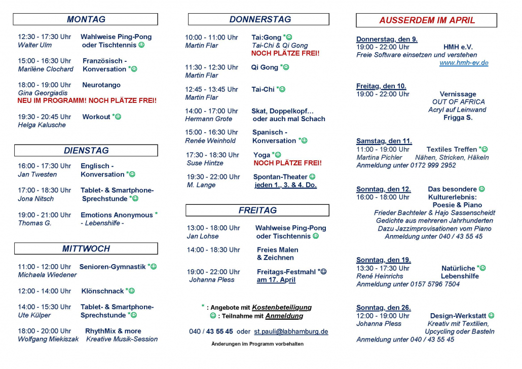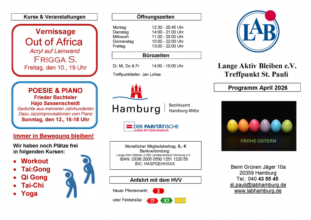 St. Pauli ist einer der buntesten Stadtteile Hamburgs und, genau wie seine Anwohner, ist der Treffpunkt gesellig und aktiv. Die Besucher des LAB sind vor allem eins: fit! Es gibt viele Angebote für die körperliche und geistige Fitness, die alle von fachkundigen Übungsleitern angeleitet werden.