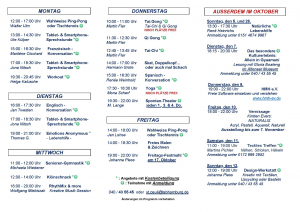Zum Angebot gehören u.a.: Gymnastik, Yoga, Qigong, Gedächtnistraining, Nähen, Sprachangebote, Spanisch und Englisch Konversation für Anfänger und Fortgeschrittene. In Planung sind Tablet- und Smartphone Beratung und vielfältige Koch-und Backaktivitäten.